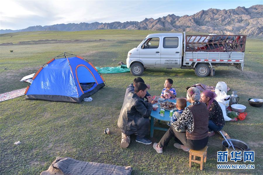 在新疆阿勒泰地區(qū)福??h,牧民在轉(zhuǎn)場(chǎng)途中吃晚餐(6月5日攝)。新華社記者丁磊攝