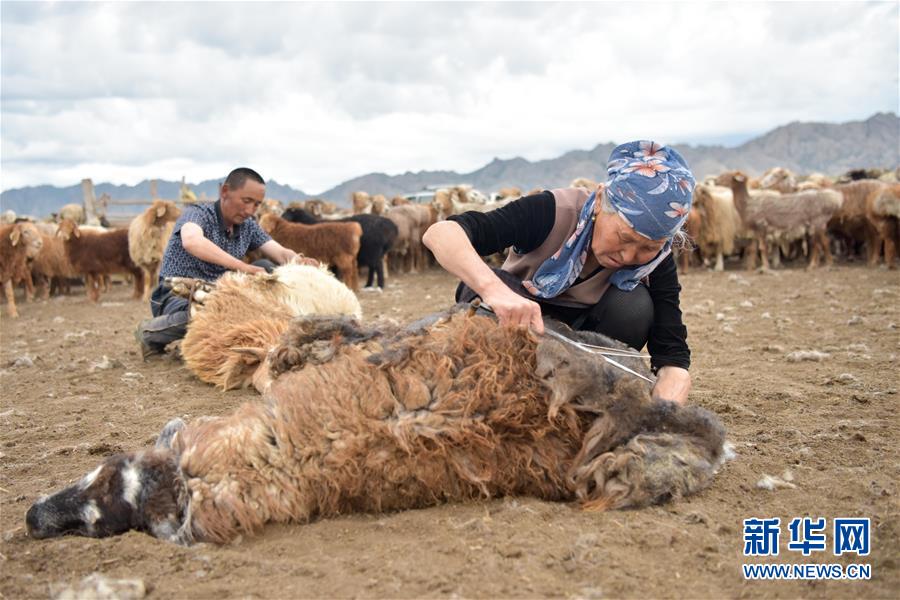 牧民趕著牛羊轉(zhuǎn)場(chǎng)到夏季牧場(chǎng),安頓妥當(dāng)后的第一個(gè)工作就是給羊剪羊毛(6月7日攝)。新華社記者丁磊攝