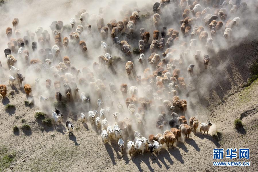 新疆阿勒泰地區(qū)福??h牧民趕著牲畜向夏季牧場(chǎng)遷徙(6月6日無(wú)人機(jī)拍攝)。新華社記者丁磊攝