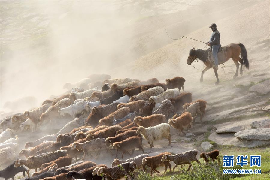 6月6日,新疆阿勒泰地區(qū)福??h牧民趕著牲畜向夏季牧場(chǎng)遷徙。 新華社記者 丁磊 攝
