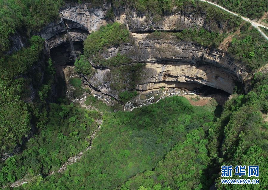 4月22日無(wú)人機(jī)拍攝的地洞河天坑。 新華社記者 張博文 攝