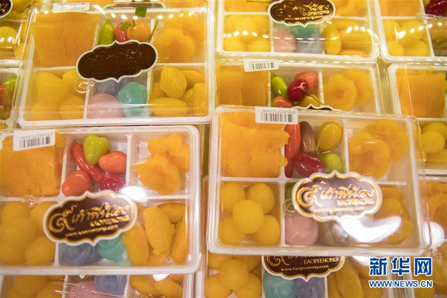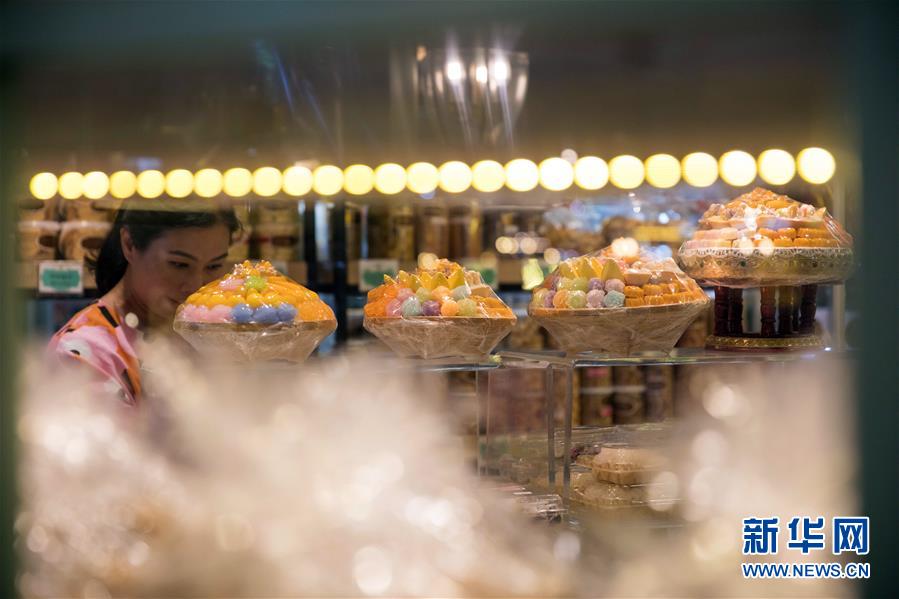 9月1日,店員在泰國曼谷著名的“九姐妹甜點”店整理貨架。