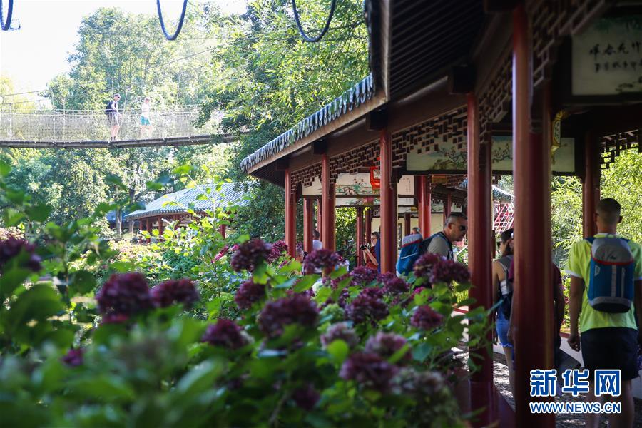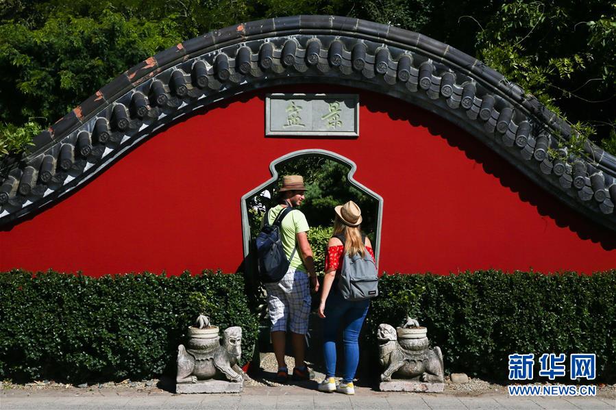 8月24日,在比利時布呂熱萊特市,游客參觀天堂動物園的“中國園”中的一處長廊。新華社記者 鄭煥松 攝