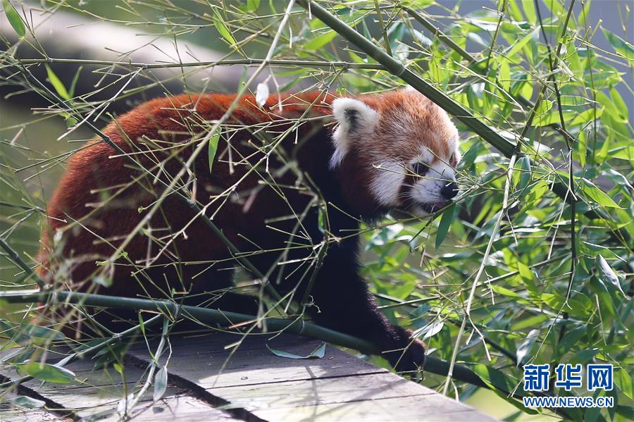 8月24日,在比利時布呂熱萊特市,一只小熊貓在天堂動物園的“中國園”覓食。新華社記者 鄭煥松 攝