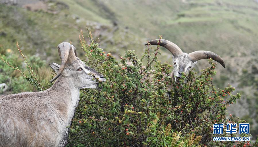 兩只巖羊在西藏山南市洛扎縣色鄉(xiāng)海拔4000米左右的盤(pán)山路邊,悠閑地吃著野果青草(9月22日攝)。 在西藏山南市洛扎縣色鄉(xiāng)海拔4000米左右的盤(pán)山路上,一群巖羊悠閑地吃著野果青草,完全不介意來(lái)往的車(chē)輛、行人和近在咫尺的鏡頭。 巖羊是國(guó)家二級(jí)保護(hù)動(dòng)物。近年來(lái),隨著西藏生態(tài)保護(hù)力度加大,巖羊數(shù)量不斷增加。 新華社記者 晉美多吉 攝