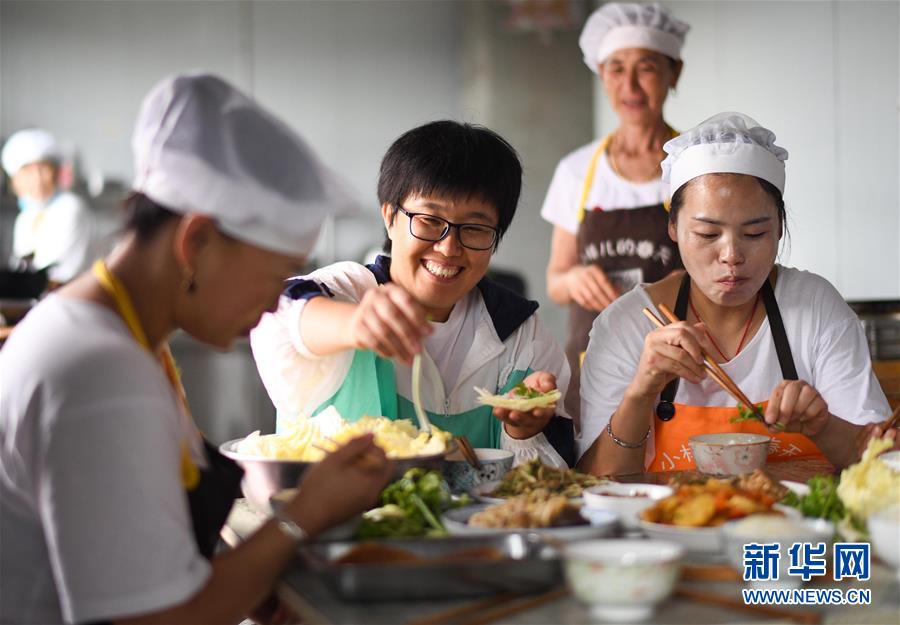 李琛璨(中)在車間中與工人們一起用午餐(8月30日攝)。新華社記者 王松 攝