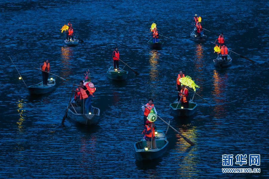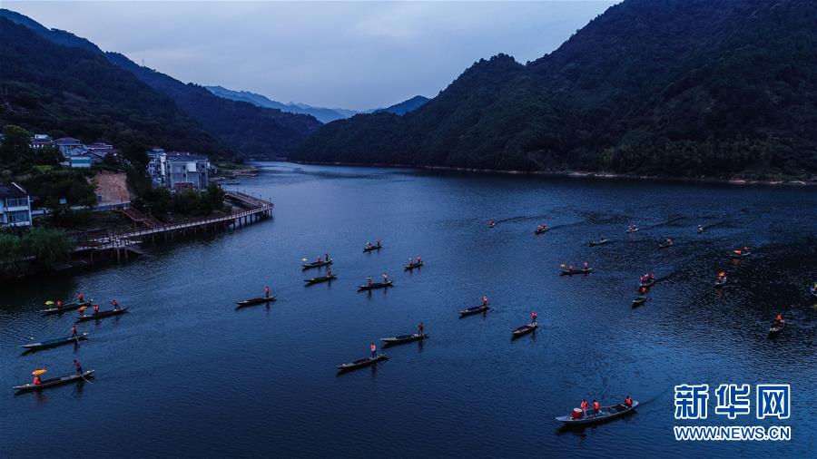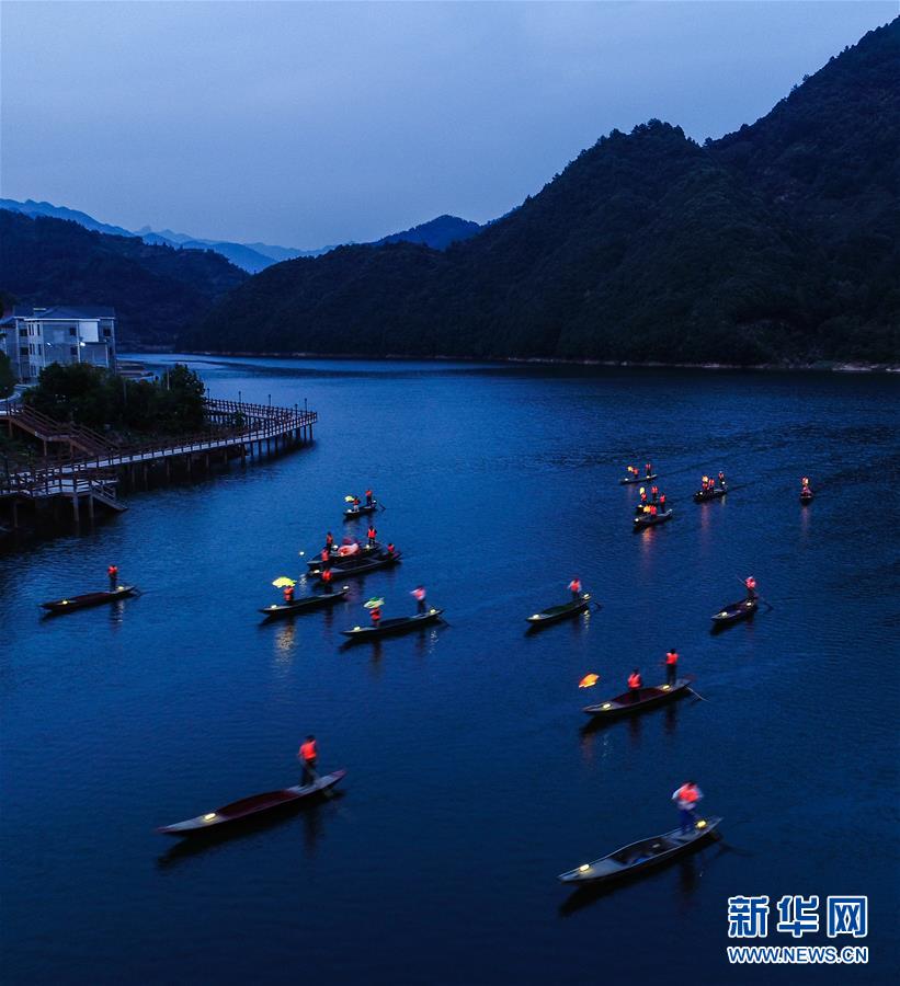 9月25日,在宋村鄉(xiāng)云源港的水面上,漁民劃著漁船,船頭點(diǎn)亮漁燈,構(gòu)成一幅“漁舟唱晚、萬家燈火”的美麗圖景(無人機(jī)拍攝)。 近年來,浙江省杭州市淳安縣宋村鄉(xiāng)積極發(fā)展鄉(xiāng)村旅游,打造漁家元素特色景觀,助力鄉(xiāng)村振興建設(shè)。目前,宋村鄉(xiāng)依托山水景觀和漁家文化,帶動(dòng)了當(dāng)?shù)鼐访袼藓图碁╂宜?、自助燒烤、農(nóng)事體驗(yàn)、民俗攝影采風(fēng)為一體的特色旅游發(fā)展。2019年1月初至7月底,全鄉(xiāng)接待游客10萬人次,實(shí)現(xiàn)旅游經(jīng)濟(jì)收入1300萬元。 新華社記者 徐昱 攝