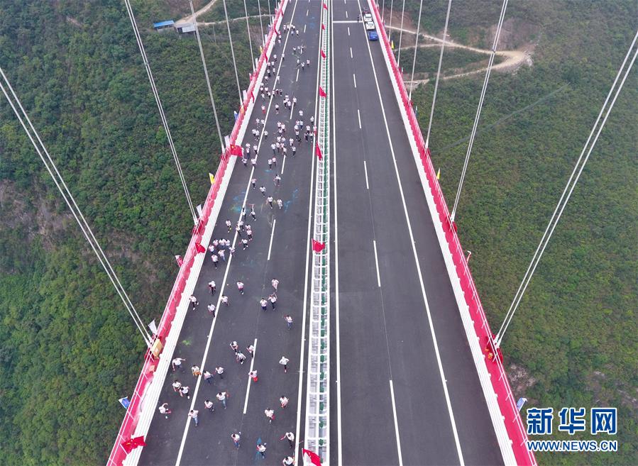9月30日,赤水河大橋建設(shè)者以一場(chǎng)彩虹跑慶祝大橋建成(無人機(jī)攝)。新華社記者劉坤攝