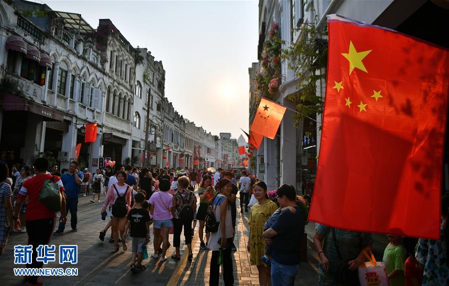 10月1日,游客在??隍T樓老街參觀游玩。當日是國慶節(jié),全國各地的人們用各種方式歡度節(jié)日。新華社記者 郭程 攝