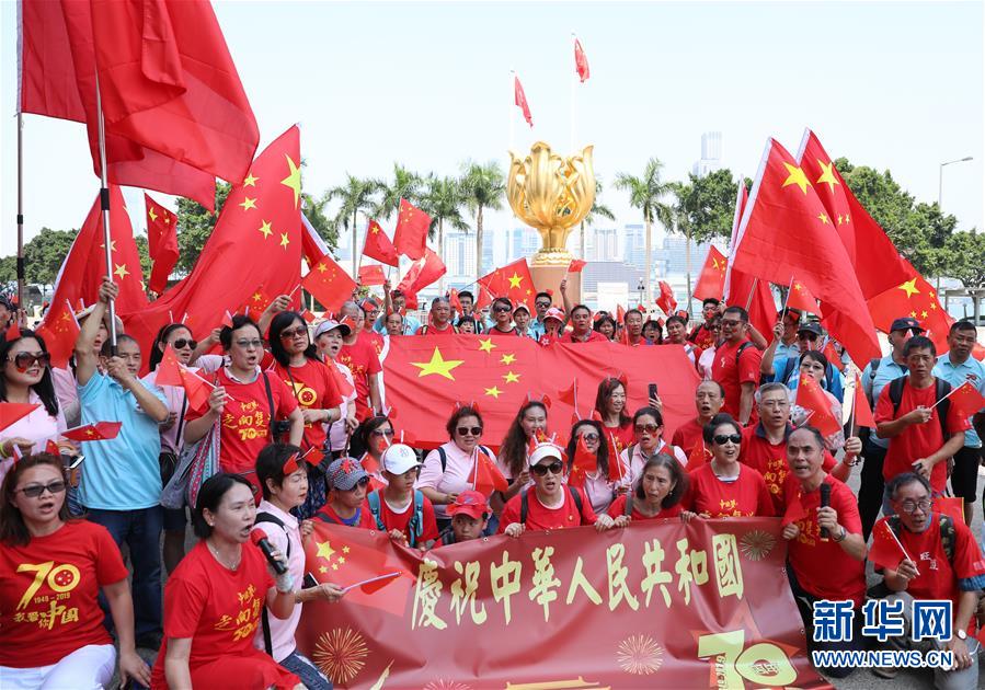 10月1日,香港市民在金紫荊廣場高唱愛國歌曲。當日是國慶節(jié),全國各地的人們用各種方式歡度節(jié)日。新華社記者 吳曉初 攝