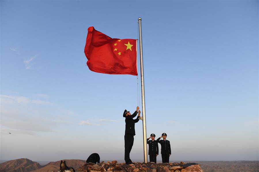 9月27日,內(nèi)蒙古自治區(qū)額濟納旗算井子邊境派出所民警在大紅山上舉行升國旗儀式。新華社記者劉磊攝