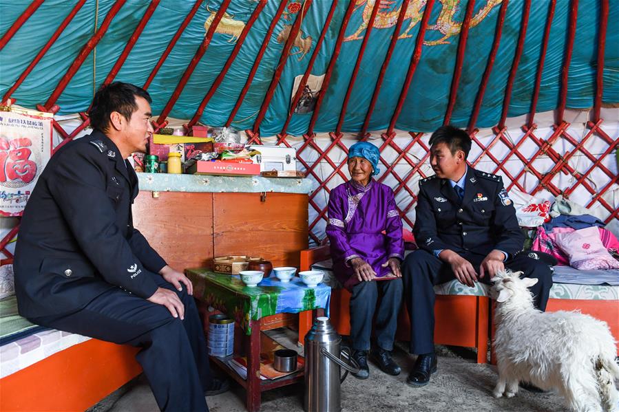 9月27日,內(nèi)蒙古自治區(qū)額濟(jì)納旗算井子邊境派出所民警走訪(fǎng)看望牧民蘇伊勒?qǐng)D雅(中)。新華社記者劉磊攝