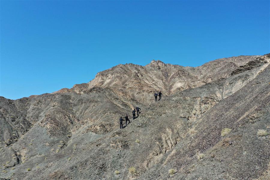 9月25日,內(nèi)蒙古自治區(qū)額濟(jì)納旗算井子邊境派出所民警登山進(jìn)行巡護(hù)。新華社記者劉磊攝