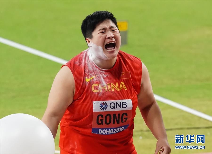 當(dāng)日,在卡塔爾多哈舉行的2019國(guó)際田聯(lián)世界田徑錦標(biāo)賽女子鉛球決賽中,衛(wèi)冕冠軍、中國(guó)選手鞏立姣以19米55的成績(jī)奪得冠軍。 新華社記者王婧嬙攝