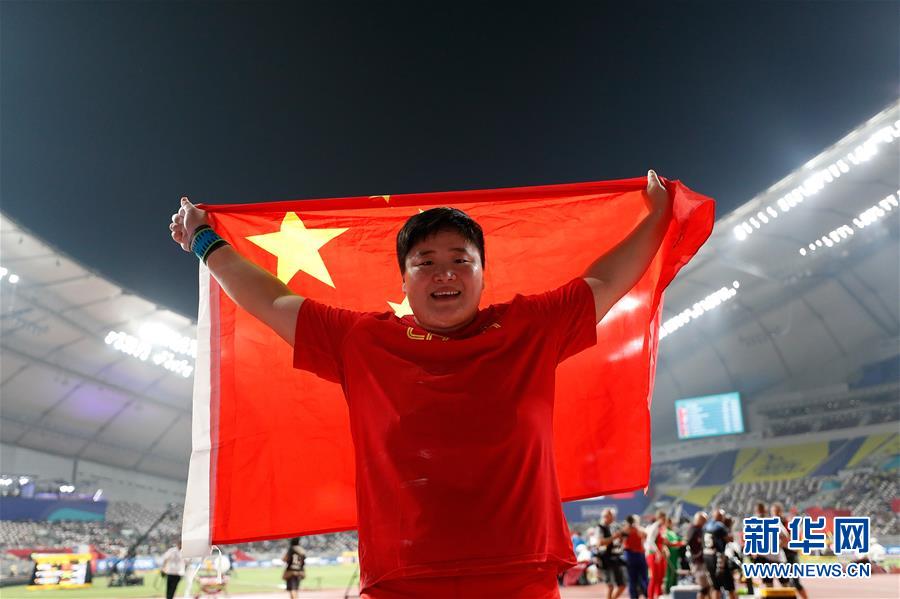 當(dāng)日,在卡塔爾多哈舉行的2019國際田聯(lián)世界田徑錦標(biāo)賽女子鉛球決賽中,衛(wèi)冕冠軍、中國選手鞏立姣以19米55的成績奪得冠軍。 新華社記者王麗莉攝