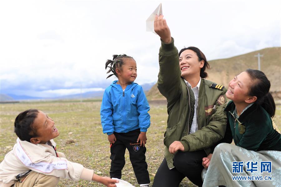 堅熱益西(右二)在牧區(qū)和弟弟妹妹一起放飛紙飛機(7月13日攝)。新華社記者普布扎西攝