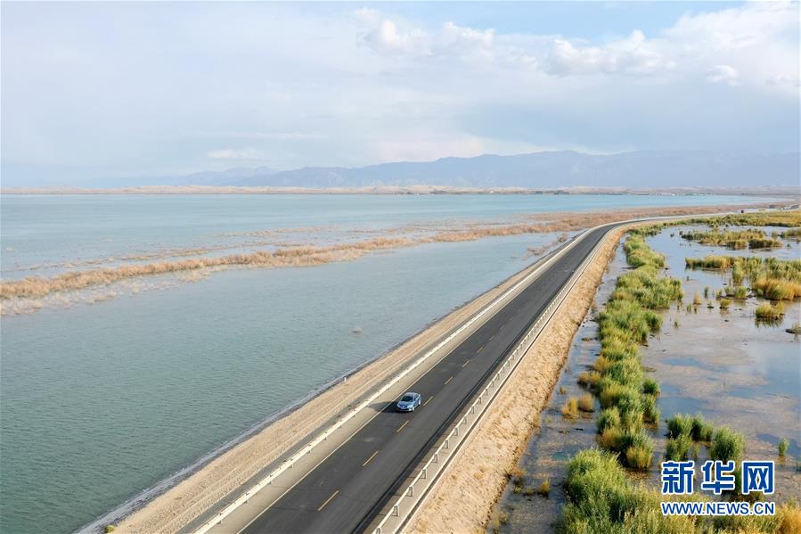 這是新疆博斯騰湖河堤公路(10月12日無人機(jī)拍攝)。入秋以來,新疆博斯騰湖碧波蕩漾,美景如畫,吸引各地游客前來游玩。新華社記者丁磊 攝
