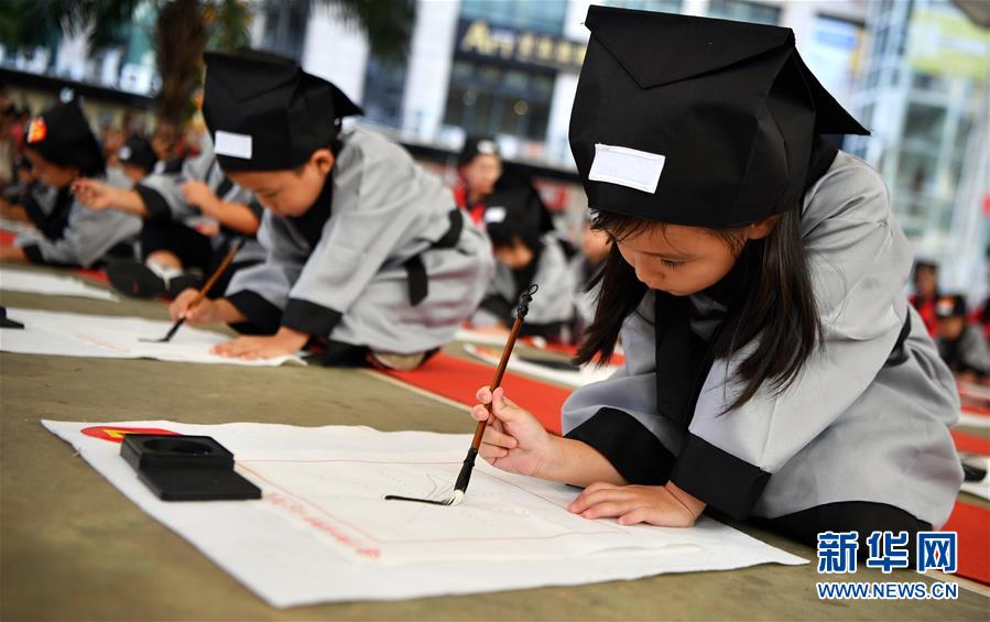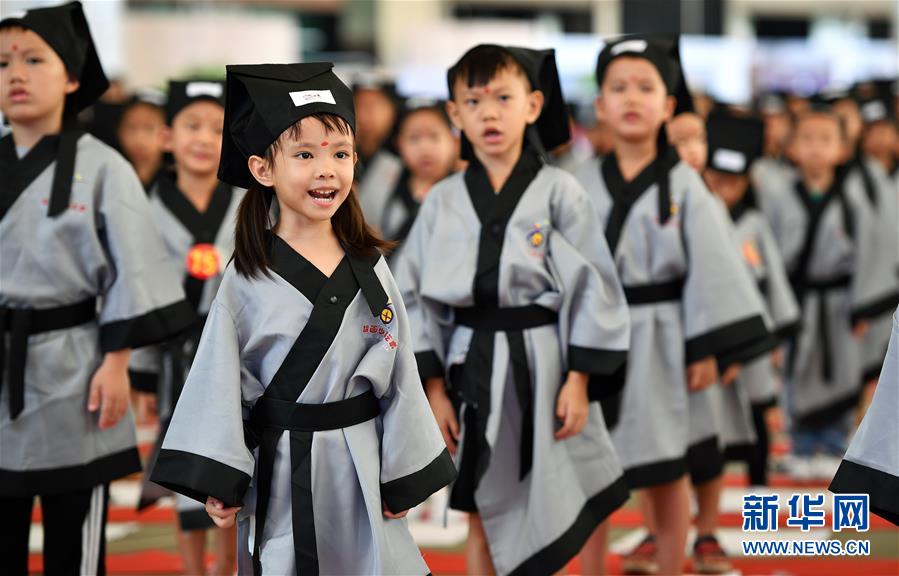 10月13日,參加儀式的小朋友在誦讀《三字經(jīng)》。當(dāng)日,??诤嬌賰核囆g(shù)中心為500名小朋友舉行“開筆禮”,通過“點朱砂,啟智慧”“習(xí)書法,描人字”等儀式讓孩子們體驗中國傳統(tǒng)文化。新華社記者郭程攝