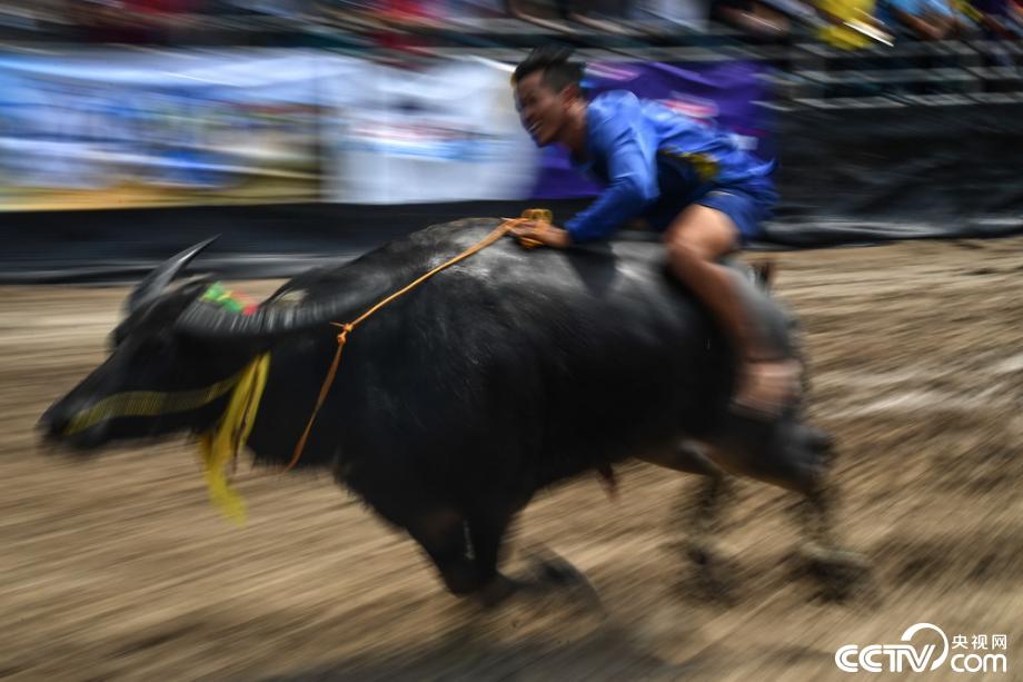 當?shù)貢r間2019年10月12日,泰國春武里舉行一年一度的水牛賽跑,選手騎??癖?。視覺中國
