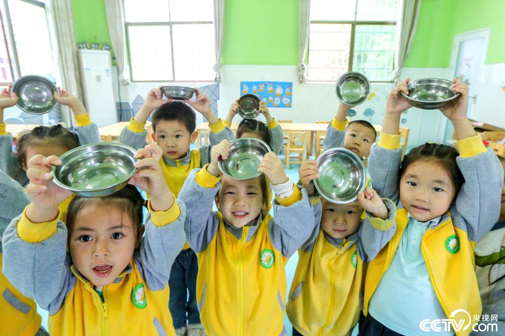 2019年10月14日,江西省吉安市峽江縣幼兒園的孩子們在展示自己飯后干凈的飯碗。圖片來源:視覺中國