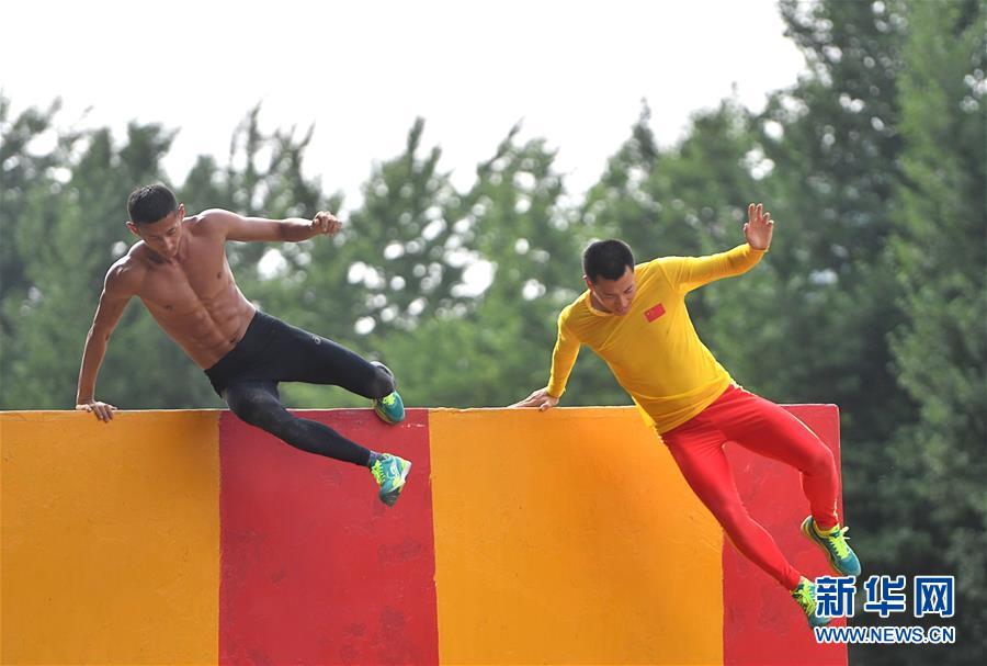2019年8月5日,八一空軍五項隊隊員王佳在進行障礙跑訓(xùn)練。新華社記者程敏攝