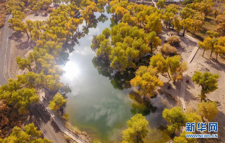 大片的胡楊樹葉由綠變黃,一眼望去,陽光下金色的樹葉襯著湛藍的天空于風中婆娑起舞。