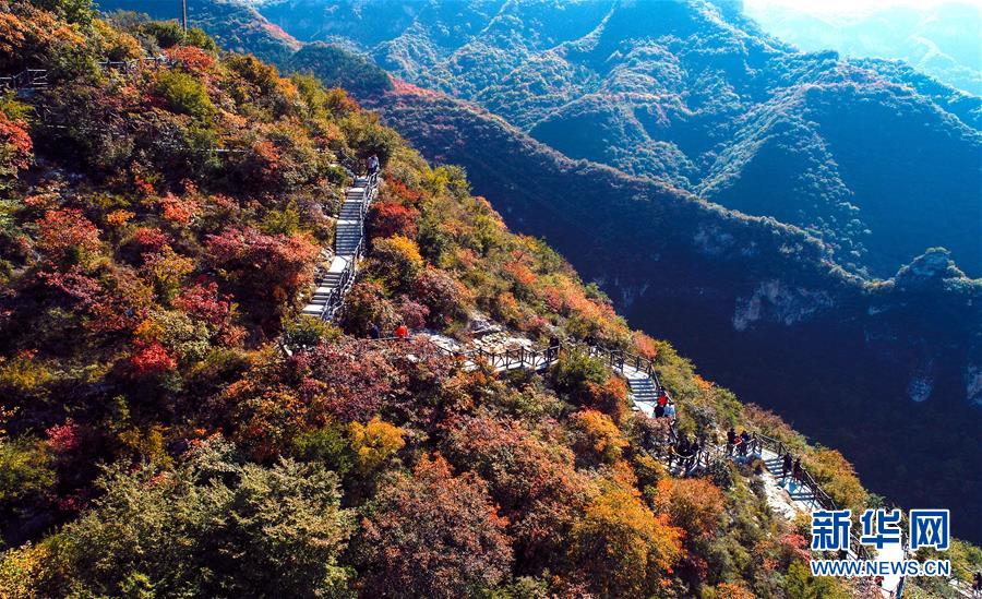 10月24日,游客在河北省武安市賀進(jìn)鎮(zhèn)后臨河村觀賞紅葉。新華社記者王曉攝