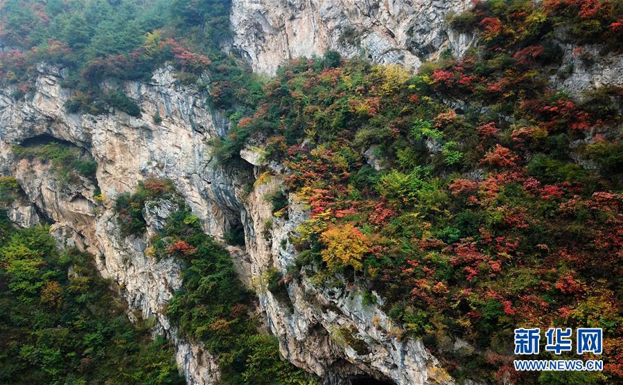 這是10月19日無人機(jī)拍攝的河北省涉縣太行紅葉大峽谷景色。新華社記者王曉攝