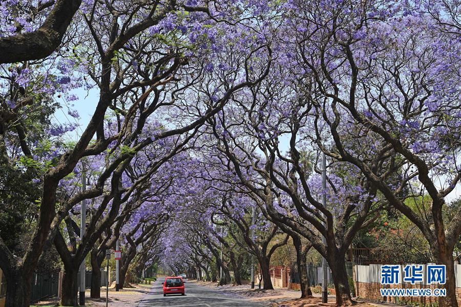 10月20日,在南非比勒陀利亞,車輛從藍(lán)花楹樹(shù)下駛過(guò)。新華社記者陳誠(chéng)攝