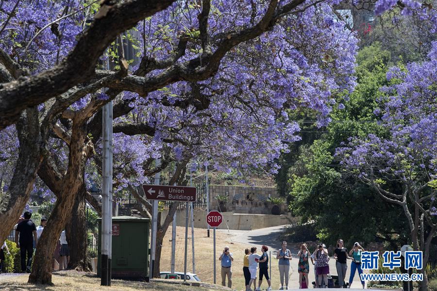 10月20日,在南非比勒陀利亞,游人在藍(lán)花楹樹(shù)下拍照。新華社記者陳誠(chéng)攝