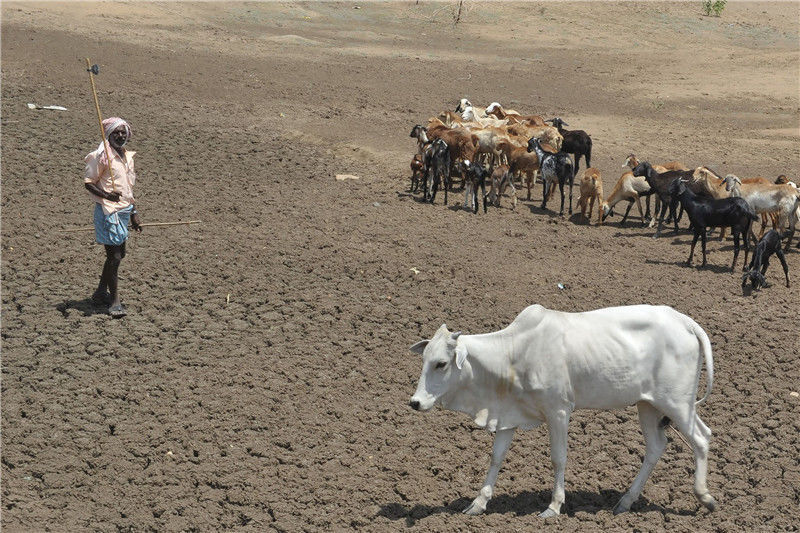 當?shù)貢r間2017年5月30日,印度特倫甘納,印度農(nóng)民在干涸的河床上放羊和牛。NOAH SEELAM/視覺中國編輯/陳進
