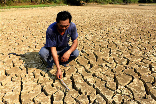 當?shù)貢r間2016年5月13日,柬埔寨甘丹省,受厄爾尼諾現(xiàn)象影響,當?shù)卦庥龈珊堤鞖?,池塘干涸開裂。