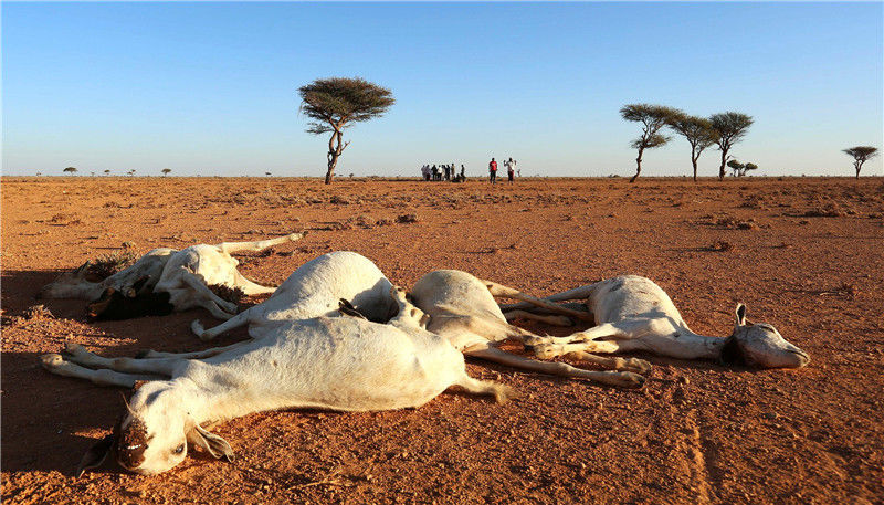 當(dāng)?shù)貢r(shí)間2016年12月15日,索馬里邦特蘭,干旱的土地上散布著羊的尸體。當(dāng)?shù)卦庥龈珊堤鞖?,牲畜受到危害?/p>