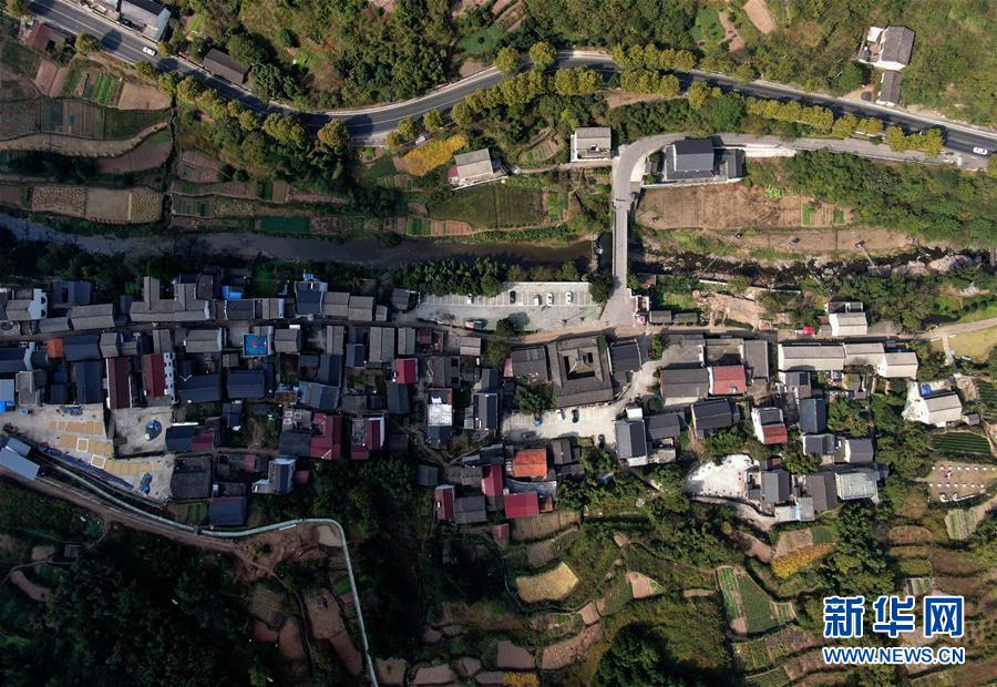 10月24日無(wú)人機(jī)拍攝的班竹村。浙江省新昌縣境內(nèi)的班竹村位于天姥山腳下,被稱為“天姥門(mén)戶”,曾是浙東“唐詩(shī)之路”上的驛站。近年來(lái),班竹村依托深厚的文化底蘊(yùn)大力發(fā)展鄉(xiāng)村旅游,全村“人人參股、戶戶分紅”,將整個(gè)村莊打造為旅游綜合體,今年以來(lái)班竹村旅游收入已超過(guò)800萬(wàn)元。新華社記者韓傳號(hào)攝