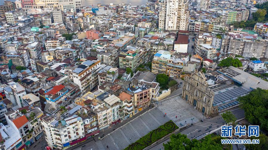 10月24日早晨無(wú)人機(jī)拍攝的澳門(mén)著名歷史遺跡——大三巴牌坊及周邊區(qū)域。2018年10月23日,港珠澳大橋正式開(kāi)通。新華社記者張金加攝