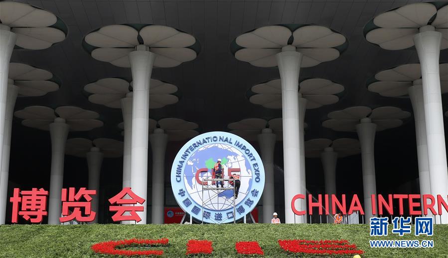 10月25日,施工人員在國展中心(上海)南廣場(chǎng)安裝進(jìn)博會(huì)標(biāo)志。 新華社記者 方喆攝