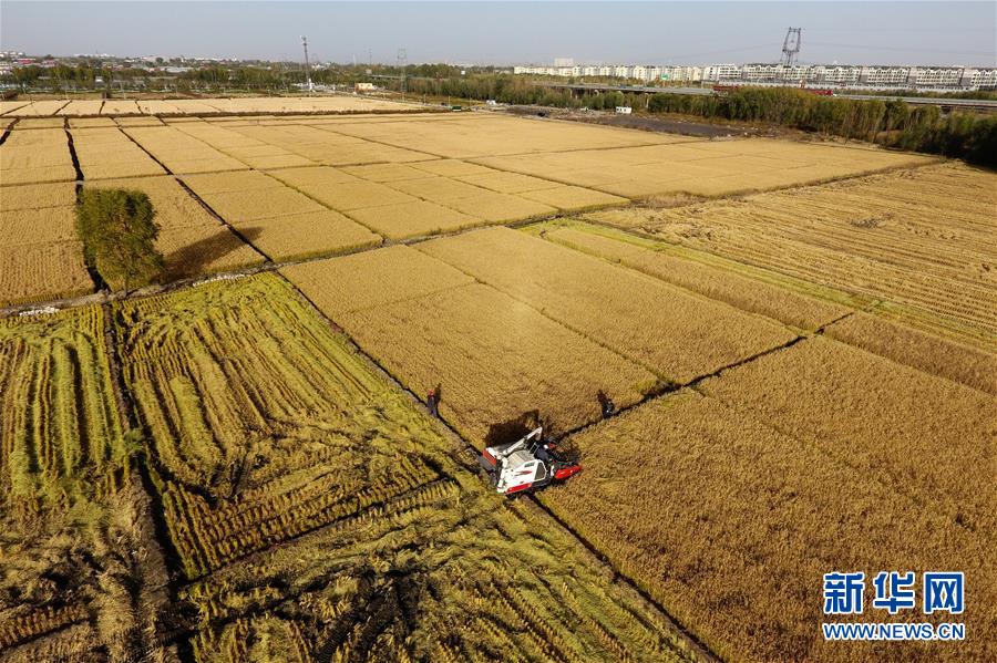 在太原市晉源區(qū)赤橋村,收割機在稻田里作業(yè)(10月28日無人機拍攝)。新華社記者詹彥攝