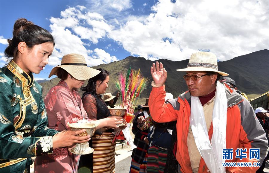 向來自遠方的新鄰居敬獻青稞酒(2018年6月18日攝)。經(jīng)過兩天的馳騁,11輛大巴和31輛大貨車緩緩駛入拉薩市堆龍德慶區(qū)古榮鄉(xiāng)嘎沖村,標志著西藏首個高海拔生態(tài)搬遷項目正式實施。新華社記者覺果攝