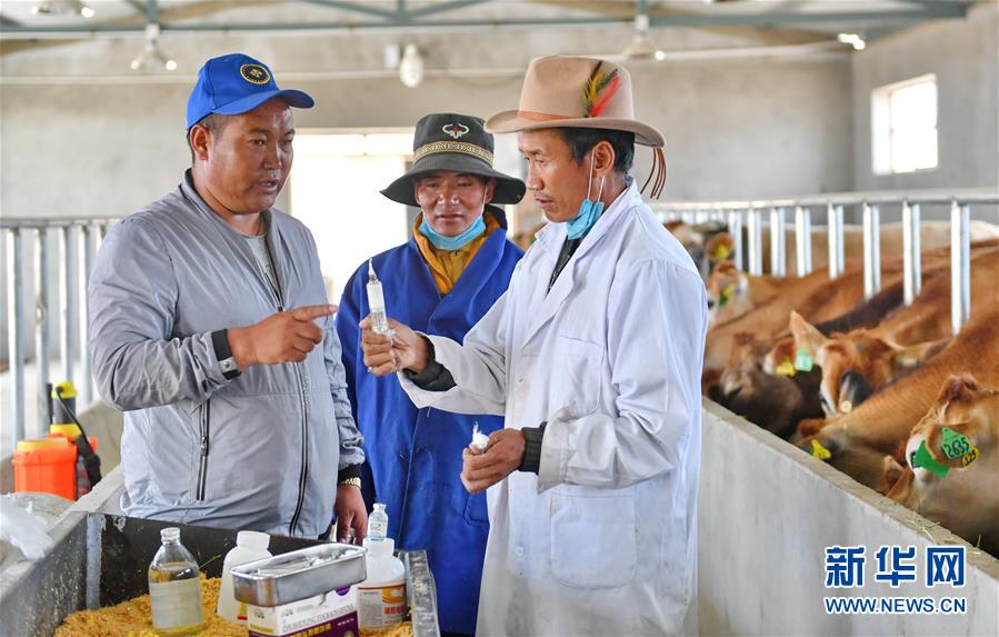 在阿里地區(qū)噶爾縣生態(tài)農業(yè)產業(yè)園奶牛場,場長貢桑其美(左)和獸醫(yī)及飼養(yǎng)員商量牛群防疫事宜(2018年8月1日攝)。新華社記者張汝鋒攝