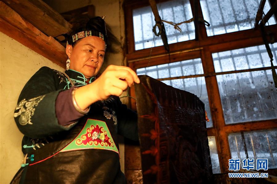 10月28日,楊芳在家中對(duì)繪好的蠟畫進(jìn)行染制。新華社記者 歐東衢 攝