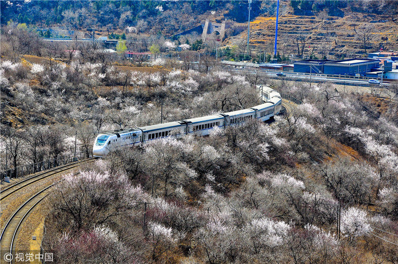 2019年3月22日,北京居庸關(guān)附近的山花盛開,S2線列車穿行在花海之中,構(gòu)成一幅美麗的畫面。時(shí)永平/千龍圖像/視覺中國編輯/陳進(jìn)