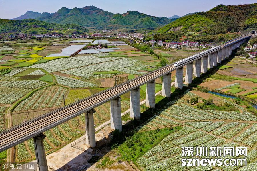 2019年4月8日,一列高鐵列車從京福高鐵安徽銅陵段一片盛開的鳳丹花海中駛過。