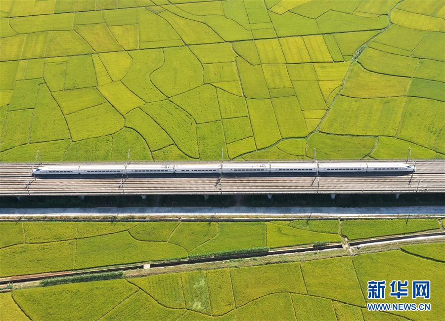 10月29日,列車從廣西賓陽縣古辣鎮(zhèn)豐收的稻田間駛過(無人機(jī)拍攝)。新華社記者陸波岸攝