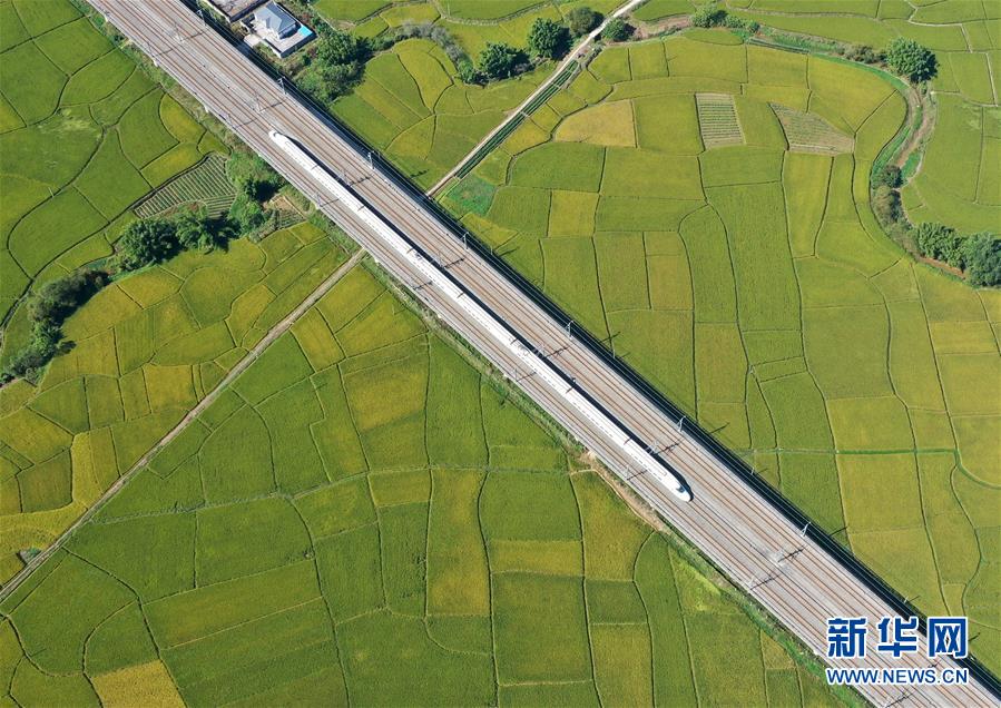 10月29日,列車從廣西賓陽縣古辣鎮(zhèn)豐收的稻田間駛過(無人機(jī)拍攝)。新華社記者陸波岸攝