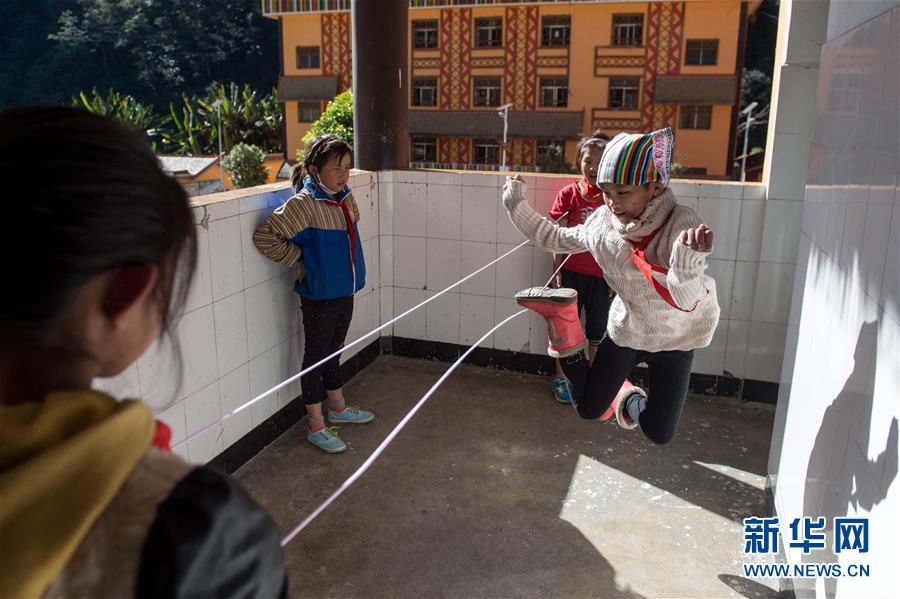 在獨(dú)龍江鄉(xiāng)中心小學(xué),孩子們在跳皮筋(2016年11月23日攝)。新華社記者胡超攝