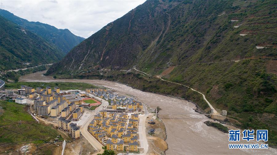 建于怒江邊的大興地鎮(zhèn)維拉壩“珠海小區(qū)”內(nèi)的學(xué)校和住房已初現(xiàn)規(guī)模(6月24日無人機(jī)拍攝)。新華社記者胡超攝