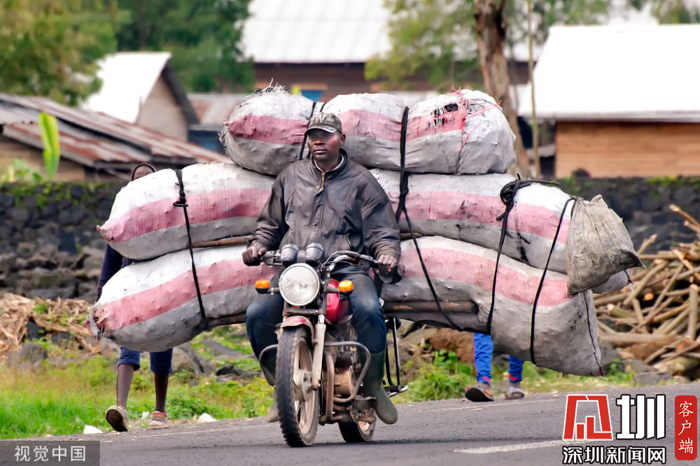 剛果,工人們將裝滿木炭的麻袋放在摩托車上,從維龍加國家公園運到剛果戈馬市。