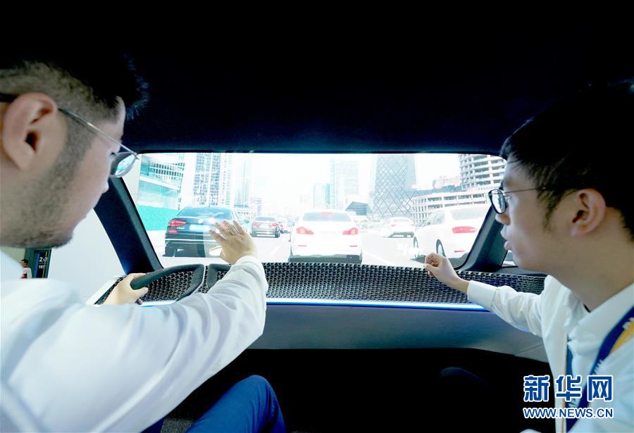 11月5日,技術(shù)工程人員(右)在第二屆進(jìn)博會(huì)汽車展區(qū)寶馬展臺(tái)“超界面”沉浸式數(shù)字體驗(yàn)倉(cāng)內(nèi)向參觀者介紹。新華社記者陳建力攝