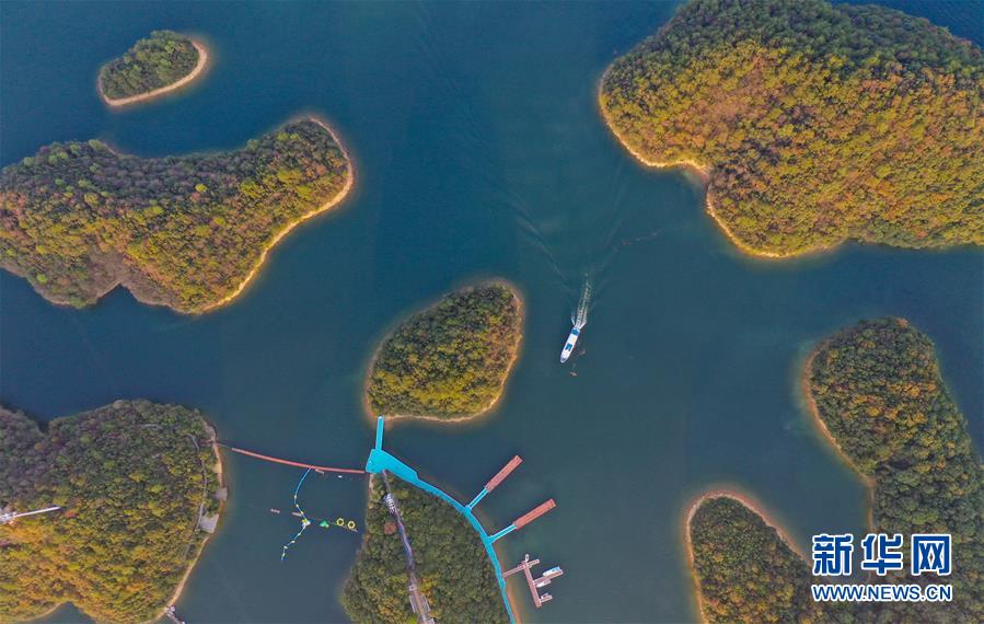 11月9日無(wú)人機(jī)拍攝的廬山西海。 當(dāng)日,落日余暉下的江西廬山西海山青水藍(lán),美不勝收。 新華社記者 周密 攝