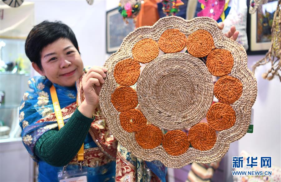 在第二屆進博會品質生活展區(qū),孟加拉國達達公司工作人員展示黃麻制品(11月8日攝)。新華社記者范培珅攝